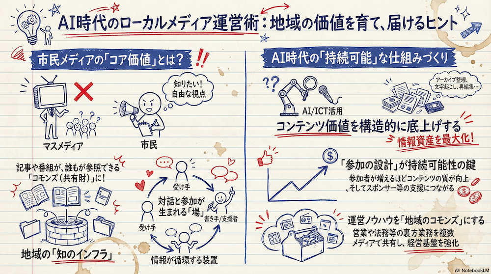 一方で、AIを含むICTの進化は、市民メディアの媒体価値を“構造的に”底上げできる。たとえば、記事や番組のアーカイブを整理して検索性を高める、タグ付けで地域資源を地図のように蓄積する、音声を文字起こしして引用しやすくする、過去記事を再編集して特集として束ね直す。コンテンツは単発で消費されるものではなく、地域の価値を見える化する資産になっていく。