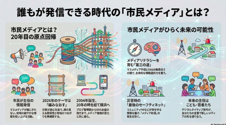 市民メディアは、地域の出来事を拾い、語り、共有し、対話を生む装置だ。その役割は、マスメディアでもSNSでも代替しきれない。伝えにくいことを伝え、生活者の目線で価値の所在を見つけ、地域のコモンズとして積み上げていく。