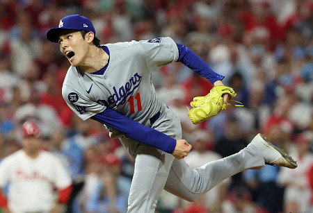 ナ・リーグ地区シリーズ第1戦、フィリーズ戦で力投するドジャースの佐々木。1回を1安打無失点で締めてセーブを記録した。ドジャースは5―3で逆転勝ちして先勝=4日、フィラデルフィア 【AFP時事】