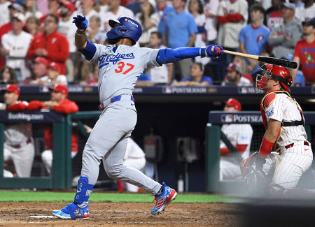 ナ・リーグ地区シリーズ第1戦、フィリーズ戦の7回、逆転3ランを放つドジャースのT・エルナンデス。ドジャースは5―3で逆転勝ちして先勝=4日、フィラデルフィア 【時事通信社】