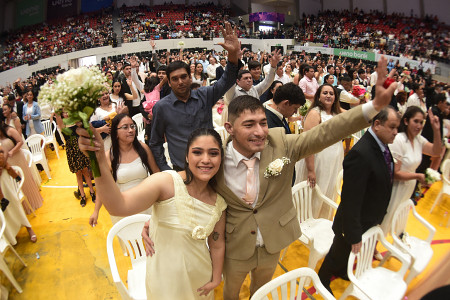 4日、南米パラグアイの首都アスンシオンで開催された合同結婚式。パラグアイ政府は経済的困窮などを理由に結婚を諦める男女を支援しており、この結婚式では約600組の新郎新婦が愛を誓った。 【AFP時事】