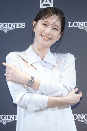スイスの高級時計ブランド「ロンジン」が発表したコレクション「プリマルナ」の発表イベントに本田翼さんが登壇。48粒のブルーサファイアをちりばめた時計を披露した=6日、都内 【時事通信フォト】
