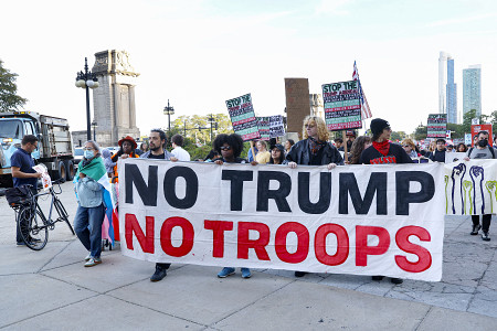 米中西部イリノイ州と同州シカゴ市は6日、トランプ政権によるシカゴへの州兵動員は違法だとして、連邦地裁に差し止めを求めて提訴した。写真は州兵動員計画への抗議デモ=9月9日、シカゴ市 【AFP時事】