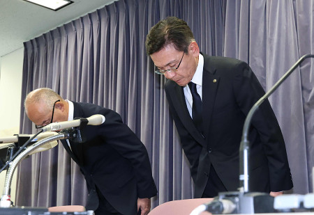 田園都市線梶が谷駅で起きた衝突脱線事故を受け、記者会見で頭を下げる東急電鉄の福田誠一社長(右)ら。「多くのお客さまにご迷惑、ご心配をおかけし、深くおわび申し上げる」と謝罪した=7日午後、東京・霞が関 【時事通信社】