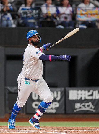 プロ野球CS。日本ハムが逆転勝ち。3―4の8回にレイエス(写真)の2点適時打で1点を勝ち越した。先発の北山は4回4失点と乱れたが、救援陣が無失点でつないだ=12日、エスコンF 【時事通信社】