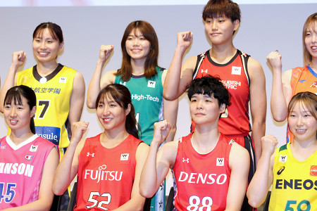 バスケットボール女子のWリーグは13日、今季開幕を18日に控えて都内で会見し、各チームの選手が意気込みを語った。富士通の宮沢(前列中央左)は「難しいこともあるが、どんな時も前を向く」と力強く話した。 【時事通信社】
