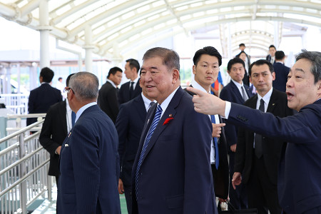 石破茂首相は13日、同日閉幕を迎えた大阪市の大阪・関西万博会場を訪問した。首相の訪問は4月12日の開会式以降、4度目。写真は水素燃料電池船「まほろば」から下船し、船体を眺める首相(中央)=代表撮影 【時事通信社】