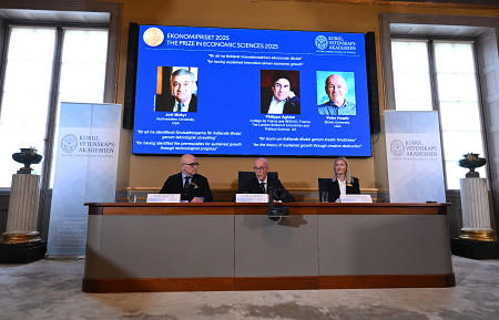 スウェーデン王立科学アカデミーは13日、2025年のノーベル経済学賞を米ノースウェスタン大のジョエル・モキイア教授ら3氏に授与すると発表した=ストックホルム 【AFP時事】