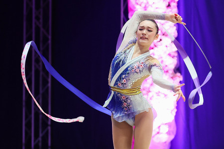 新体操のイオン・カップ世界クラブ選手権は13日、東京体育館で決勝の後半2種目が行われ、個人総合は喜田未来乃が4種目合計101.700点で9位だった。写真はリボンの演技をする喜田。 【時事通信社】