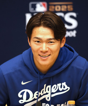 ブルワーズとのナ・リーグ優勝決定シリーズを前に記者の質問に答えるドジャースの山本。今回のシリーズ前に金色だった髪を黒色に変えて短くした=13日、ミルウォーキー 【時事通信社】