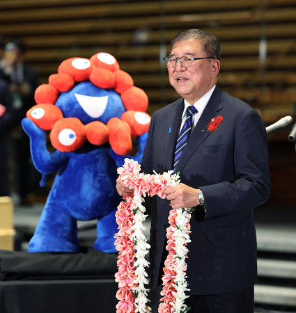 大阪・関西万博が13日に閉幕したことを受け、首相官邸で14日、エントランスに設置されていた公式キャラクター「ミャクミャク」の縫いぐるみの見送り式が開かれた。写真は見送り式に臨む石破茂首相。 【時事通信社】