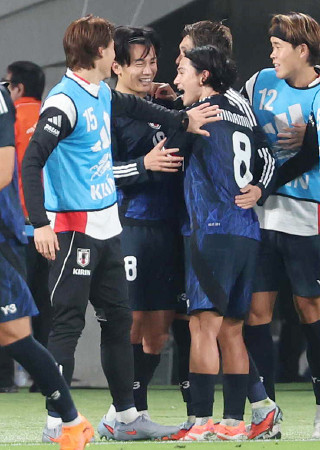 サッカーの国際親善試合は14日、味の素スタジアムで行われ、日本代表がW杯で5度の優勝を誇る「サッカー王国」のブラジル代表を3―2で破った。日本がブラジルに勝つのは初めて。写真は祝福される上田。 【時事通信社】