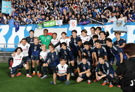 サッカーの国際親善試合は14日、東京・味の素スタジアムで行われ、日本代表はブラジル代表を3―2で破り、歴史的勝利を挙げた。写真は笑顔の日本代表。 【時事通信社】