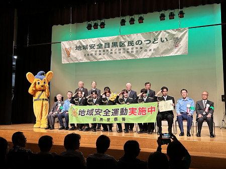 警視庁目黒署などは17日、東京都目黒区で「区民のつどい」を開催。詐欺の手口を紹介する寸劇のほか、6人組音楽グループ「MATSURI」が登壇し、防犯トークや歌唱を通して区民らに防犯意識向上を訴えた。 【時事通信社】