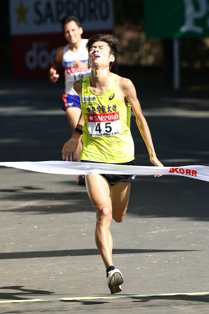箱根駅伝予選会。ゴールする中央学院大の近田。中央学院大など上位10校が本大会出場を決めた=18日、東京・国営昭和記念公園 【時事通信社】