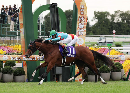 中央競馬の3歳牝馬3冠レース最終戦、第30回秋華賞(GI)。クリストフ・ルメール騎乗で単勝2番人気のエンブロイダリーが1分58秒3で優勝し、4月の桜花賞と合わせて2冠を達成した=19日、京都競馬場 【時事通信社】