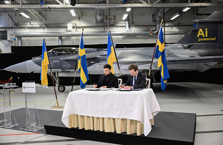 ウクライナのゼレンスキー大統領は22日、スウェーデンでクリステション首相と会談、同国製戦闘機「グリペン」を将来的に100~150機購入する契約を進める文書に署名した。ウクライナのメディアなどが伝えた。 【AFP時事】