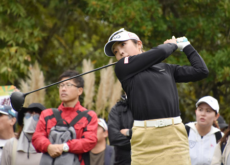 延田マスターズGCレディース第3日。4打差の首位で出た佐久間朱莉が64をマークし、通算20アンダーに伸ばしてリードを広げた。8打差の2位に菅楓華が続く=25日、兵庫・マスターズGC 【時事通信社】