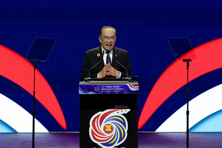 東南アジア諸国連合(ASEAN)は26日、議長国マレーシアの首都クアラルンプールで首脳会議を開いた。写真は、会議に先立ちあいさつする同国のアンワル首相。 【ロイター時事】