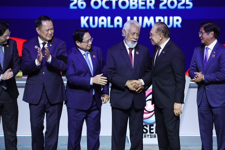 東南アジア諸国連合(ASEAN)は26日、クアラルンプールで開かれた首脳会議に合わせ、東ティモールの正式加盟を承認した。写真は、首脳らに迎えられる東ティモールのグスマン首相(右から3人目)。 【EPA時事】