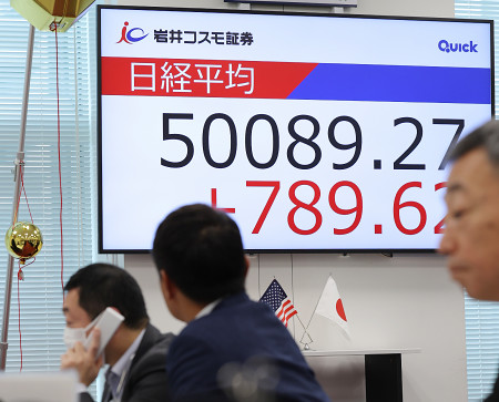 史上初めて5万円を超えた日経平均株価を示すモニター=27日午前、東京都中央区 【時事通信社】