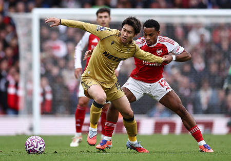 サッカーの欧州各国リーグは26日、各地で行われ、イングランド・プレミアリーグで鎌田大地(中央)のクリスタルパレスはアウェーでアーセナルに0―1で敗れた。鎌田は先発して後半途中までプレー=ロンドン 【AFP時事】