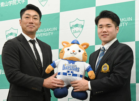 DeNAの相川亮二監督(左)らが相模原市の青学大を訪れ、ドラフト1位で指名した小田康一郎内野手にあいさつした。小田は「少しずつ実感が湧いてきた。優勝に導けるような選手になりたい」と決意を述べた=27日 【時事通信社】