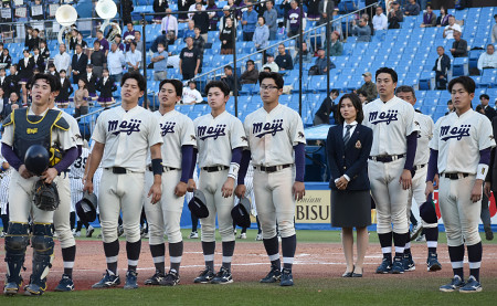 東京六大学野球秋季リーグ戦第7週第2日は27日、神宮球場で2回戦2試合が行われ、5季ぶりの優勝を決めていた明大は立大に15―0で大勝し、10戦全勝の勝ち点5で今季を終えた。 【時事通信社】