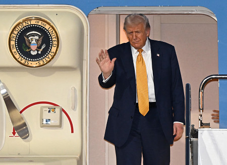 アジア歴訪中のトランプ米大統領は27日午後、訪問先のマレーシアから日本に到着した。同氏の来日は約6年ぶり。写真は、羽田空港に到着したトランプ氏=東京都大田区(代表撮影) 【時事通信社】
