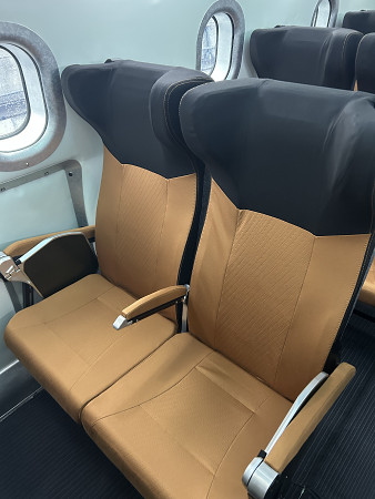 JR東海は31日、山梨県内のリニア実験線で新型試験車両「M10」の内部を報道陣に公開した。客室は白を基調に茶色の座席を配置した落ち着いた内装。 【時事通信社】