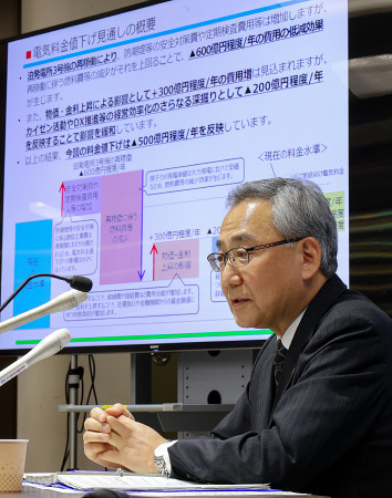 北海道電力は31日、泊原発3号機(北海道泊村)の再稼働後、家庭用電気料金を11%程度引き下げるとの見通しを示した。写真は記者会見する斎藤晋社長=同日午後、札幌市中央区 【時事通信社】