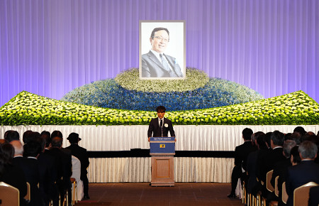 日本サッカー界が誇る不世出のストライカーで、8月に81歳で亡くなった元日本代表FW釜本邦茂さんのお別れの会が22日、都内で営まれた。写真は、謝辞を述べる日本サッカー協会の宮本恒靖会長(中央)=代表撮影 【時事通信社】