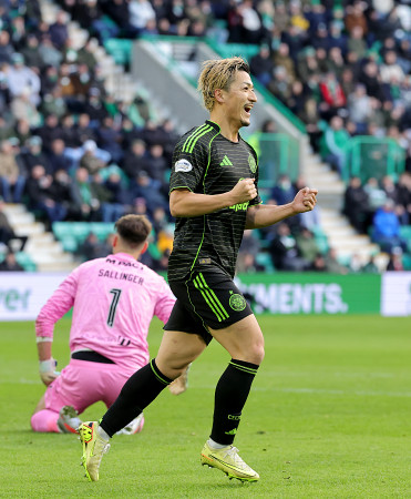 スコットランド・プレミアリーグでセルティックの前田大然はハイバーニアン戦にフル出場し、今季4点目のゴールを決めた。チームは2―1で勝利。写真は先制ゴールを決め、喜ぶ前田=11月30日、英エディンバラ 【PA Images時事】