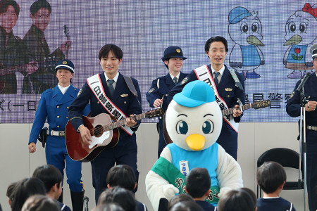 大阪府警鶴見署は1日、お笑いコンビ「ラニーノーズ」を一日署長に任命した。地元の幼稚園児らの前でギターを使ったネタを披露し、交通安全に関するクイズを通してルールの順守を呼び掛けた。 【時事通信社】