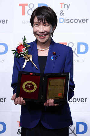 「2025T&D保険グループ新語・流行語大賞」で年間大賞に「働いて働いて働いて働いて働いてまいります/女性首相」が選ばれた高市早苗首相=1日午後、東京都千代田区 【時事通信社】