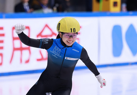 スピードスケート・ショートトラックのミラノ・コルティナ五輪代表最終選考会を兼ねた全日本選手権最終日。女子1000メートルで優勝し、笑顔を見せる長森遥南=14日、東京辰巳アイスアリーナ 【時事通信社】
