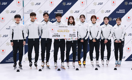 スピードスケート・ショートトラックのミラノ・コルティナ五輪代表最終選考会を兼ねた全日本選手権最終日。五輪代表に選出された選手たち=14日、東京辰巳アイスアリーナ 【時事通信社】