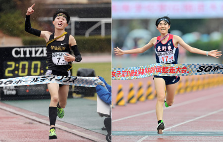 全国高校駅伝競走。男子の1位でゴールする学法石川のアンカー美沢(写真左)と女子の1位でゴールする長野東のアンカー今井=21日、たけびしスタジアム京都 【時事通信社】