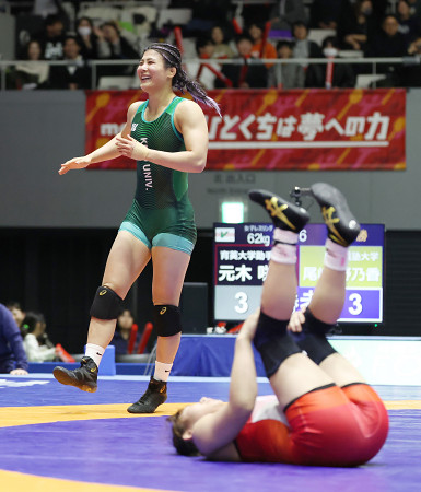レスリングの全日本選手権最終日。女子62キロ級は、パリ五輪68キロ級銅の尾崎野乃香(奥)が同五輪62キロ級金の元木咲良を破って2連覇=21日、東京・駒沢体育館 【時事通信社】