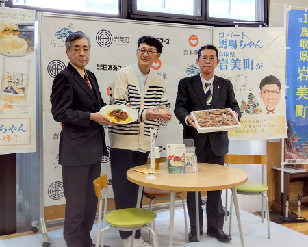 鳥取県岩美町は、アイデア料理の達人で知られるお笑いトリオ「ロバート」の馬場裕之さんと共同で、ふるさと納税返礼品用のエビ商品を開発した。写真は新商品を発表する長戸清町長(右)、馬場さん(中央)ら。 【時事通信社】
