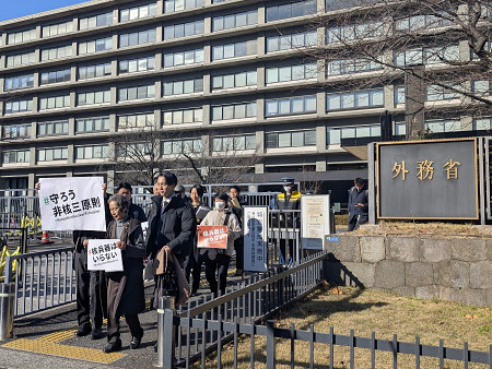 日本は核を保有すべきだとする政府高官の発言を受け、被爆者や市民団体でつくる「核兵器廃絶日本NGO連絡会」のメンバーらが23日、外務省を訪れて高市早苗首相宛ての要請文を提出した。 【時事通信社】