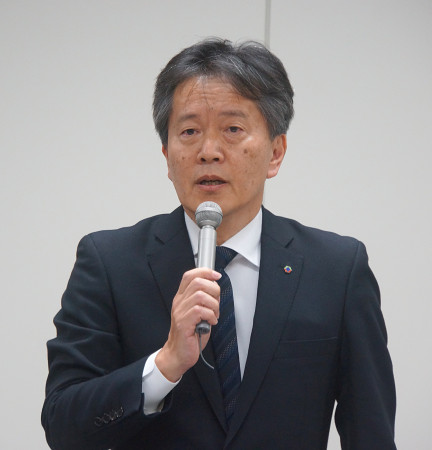東海テレビは24日、小島浩資会長が23日付で辞任したと発表した。写真は記者会見する東海テレビの林泰敬社長=同日午後、名古屋市東区 【時事通信社】