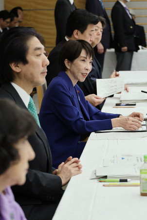 政府は25日、首相官邸で経済財政諮問会議(議長・高市早苗首相=手前から3人目)を開き、来年夏の経済財政運営と改革の基本方針「骨太の方針」策定に向けた課題を議論した。 【時事通信社】