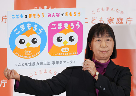 こども家庭庁は25日、子どもと接する仕事に従事する人の性犯罪歴を確認する新制度「日本版DBS」に参加している事業者に付与する認定マーク「こまもろう」のデザインを公表した=東京都千代田区 【時事通信社】