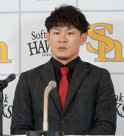 契約更改交渉を終え、記者会見するソフトバンクの牧原大。5000万円増の1億5000万円で更改した。年俸変動制の3年契約を結んでおり、来季が最終年。(金額は推定)=25日、みずほペイペイドーム福岡 【時事通信社】