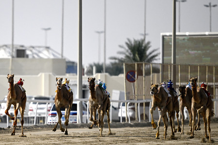 25日、中東カタールのレース場で、「ロボット騎手」を乗せ疾走するラクダ。ロボットが握る手綱を遠隔で操作し、内蔵スピーカーを通じて人の声を伝え、ラクダを走らせている。 【AFP時事】