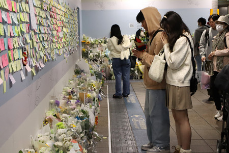 台湾・台北市中心部の台北駅や繁華街で刃物などを持った男が通行人らを無差別に襲い、3人が死亡し、11人が重軽傷を負った事件から26日で1週間となった。写真は襲撃事件現場近くで手を合わせる人ら=25日撮影 【時事通信社】