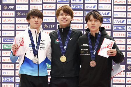 ミラノ・コルティナ五輪の代表選考会を兼ねるスピードスケートの全日本選手権最終日。男子1000メートルで優勝した山田和哉(中央)。左は2位の野々村太陽、右は3位の森重航=28日、長野・エムウェーブ 【時事通信社】