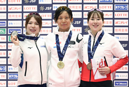 ミラノ・コルティナ五輪の代表選考会を兼ねるスピードスケートの全日本選手権最終日。女子1500メートルで優勝した高木美帆(中央)。左は2位の佐藤綾乃、右は3位の堀川桃香=28日、長野・エムウェーブ 【時事通信社】