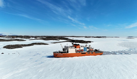 南極観測船「しらせ」は砕氷しながら昭和基地に近づき、27日午後0時44分(日本時間同6時44分)、約1700メートル沖の氷海の中に停泊し「接岸」した(小型無人機で撮影、南極観測隊同行記者) 【時事通信社】